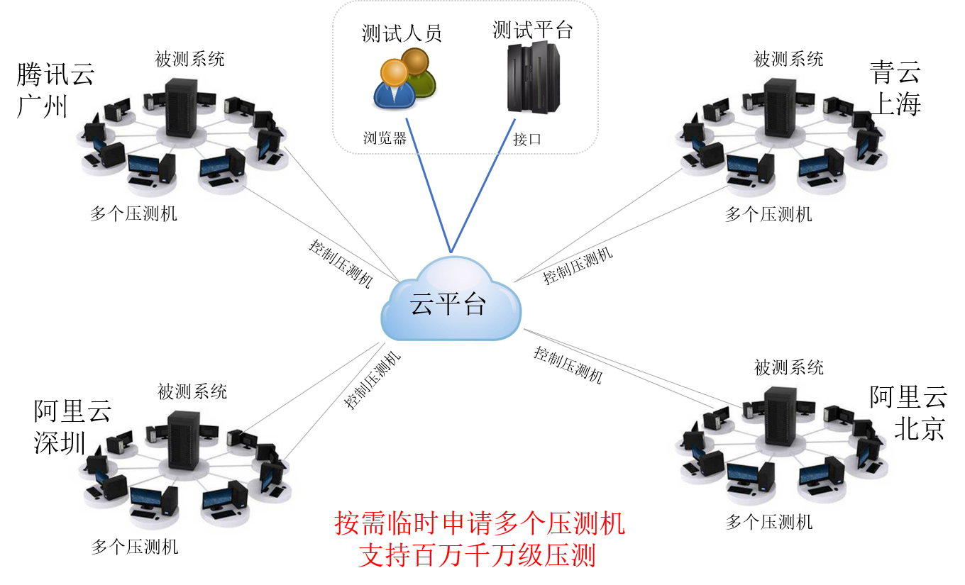 kylinTOP云平台支持将压测机部署到公有云上,按需申请一定数量的压测机,压测机支持部署在不同云厂家,不同区域;支持万级、甚至百万级的并发测试。由于通过互联网访问被测系统,云厂家对网络带宽进行限制,一般每台压测机带宽限制200 Mb