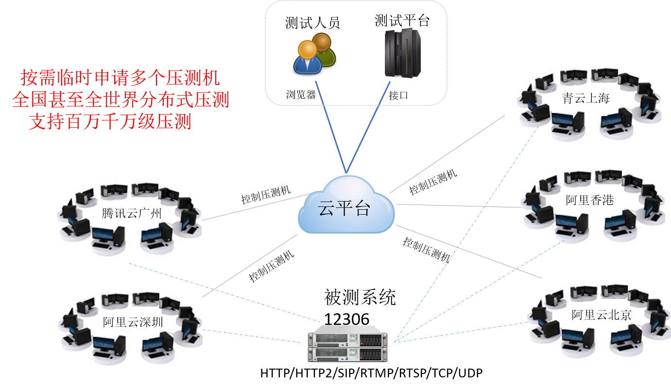 如果您的软件系统(例如12306火车订票系统)部署在公有云或互联网某些机房,需要全国不同地区进行全链路压测,模拟万级、甚至百万级的用户访问您的系统,以便验证是否软件系统支持对应数量的用户并发,而不出现响应慢或系统奔溃问题。通过压测结果,改变以及优化软件系统使用的服务器数量、网络带宽、架构组网、CDN位置。