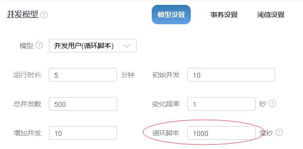 然后设置并发循环脚本时间为1000毫秒,表示1秒只运行一次脚本,因为目标是1秒1000个脚本,如果不设置1000毫秒,则可能一个并发运行一个脚本花费200毫秒,则1秒内可能就运行了5个脚本,1000个并发就一秒运行了5000个脚本,与目标不一致。