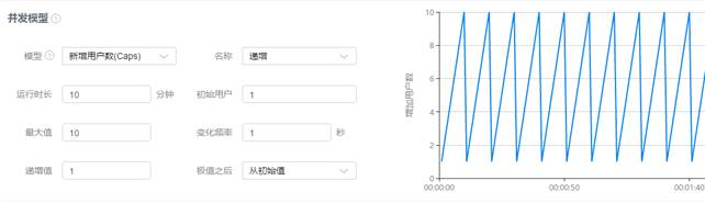 选择“用户并发模型”,初始并发10个,然后每分钟增加5个并发。上面设置表示第1秒启动并运行10个新并发,然后到第60秒还是一直保持10个并发;第61秒再启动并运行5个新并发(这时的并发总数将为15个),第2分钟再启动5个新并发(此时总并发数20个)。