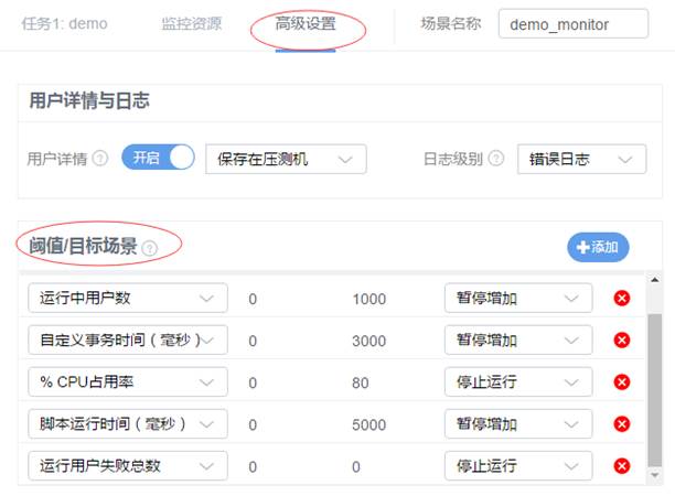 4、 测试场景停止条件(通过阈值方式)定制:停止时间、失败数、失败率