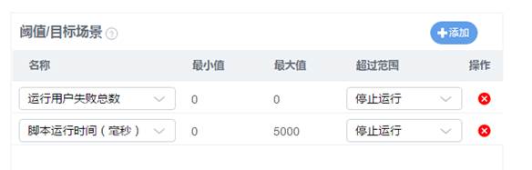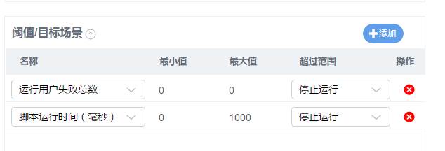 通过阈值设置停止测试条件,通过脚本时间阈值设置超过1000毫秒则停止运行,因为超过1000毫秒则不符合目标了,达不到目标场景;另外,如果出现一个脚本失败,也是达不到目标场景。