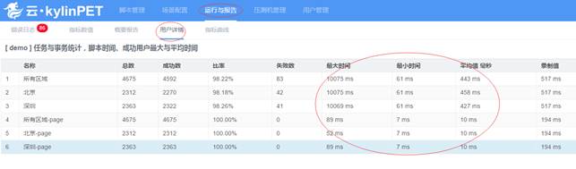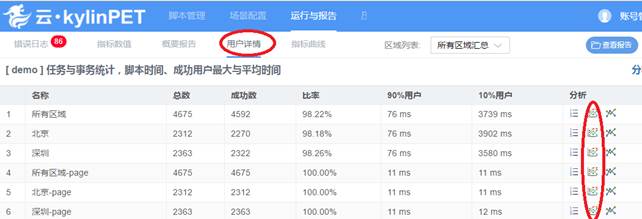 运行结束可以通过“用户详情”查看每个脚本(虚拟用户的运行情况),即时间