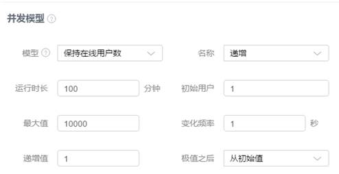 如果选择“用户并发模型”,通过该配置可以达到某个指标值后维持目前的并发个数并发一直运行,如果需要停止,可以手动点击停止按钮或设置停止时间等条件。