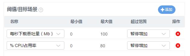 然后再通过阈值设置设置一些目标条件,注意,这里选择的是“暂停增加用户”,下图举例,如果包括CPU 80%也可以添加到阈值(需要在服务器安装monitor,且配置与monitor连接成功)