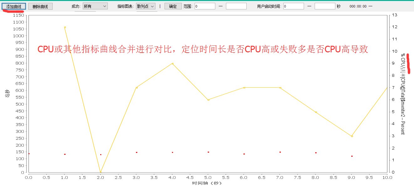 5) 支持打印每个虚拟用户、HTTP请求时间散点图,并与吞吐量、CPU等指标曲线合并比较