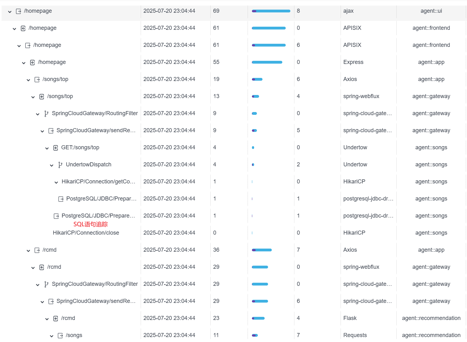 奇林测试平台 (kylinTOP)集成APM实现每一个虚拟用户、每一个事务、每一个请求(接口)都可以直接关联apm调用链,当性能慢或失败时可快速定界定位到问题(慢SQL或代码调用栈)。不需要开发适配修改,而是无侵入代码,只需部署即可。