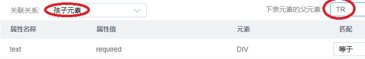 在“下表元素的父元素”输入“TR”,表示先查到“required”这个元素,再递归它的父元素直到元素为“TR”(表格行),即可得到“required”这一行元素,然后再通过“孩子元素”来定位“删除按钮”,即先查一个页面唯一元素再通过它来协助定位